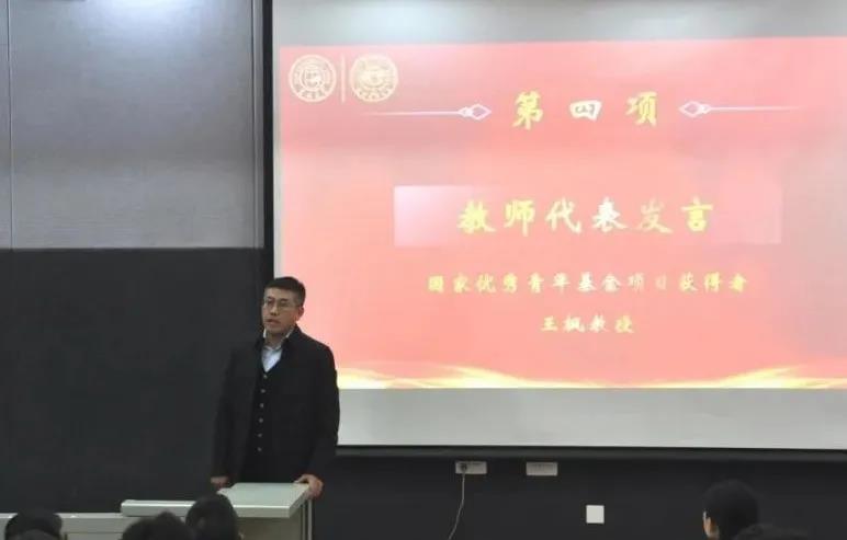 教师代表,国家优秀青年科学基金项目获得者王枫教授发言。他首先代表学院全体教师欢迎各位新同学的到来。王枫从自己读研期间的感受出发,以“新鲜”、“焦躁”、“兴奋”三个关键词入手勉励同学们要惜时、自强、博学,充分利用在校学习的黄金阶段,既要脚踏实地学习,也要不忘仰望星空,保持对未来科学领域的热情与执著。