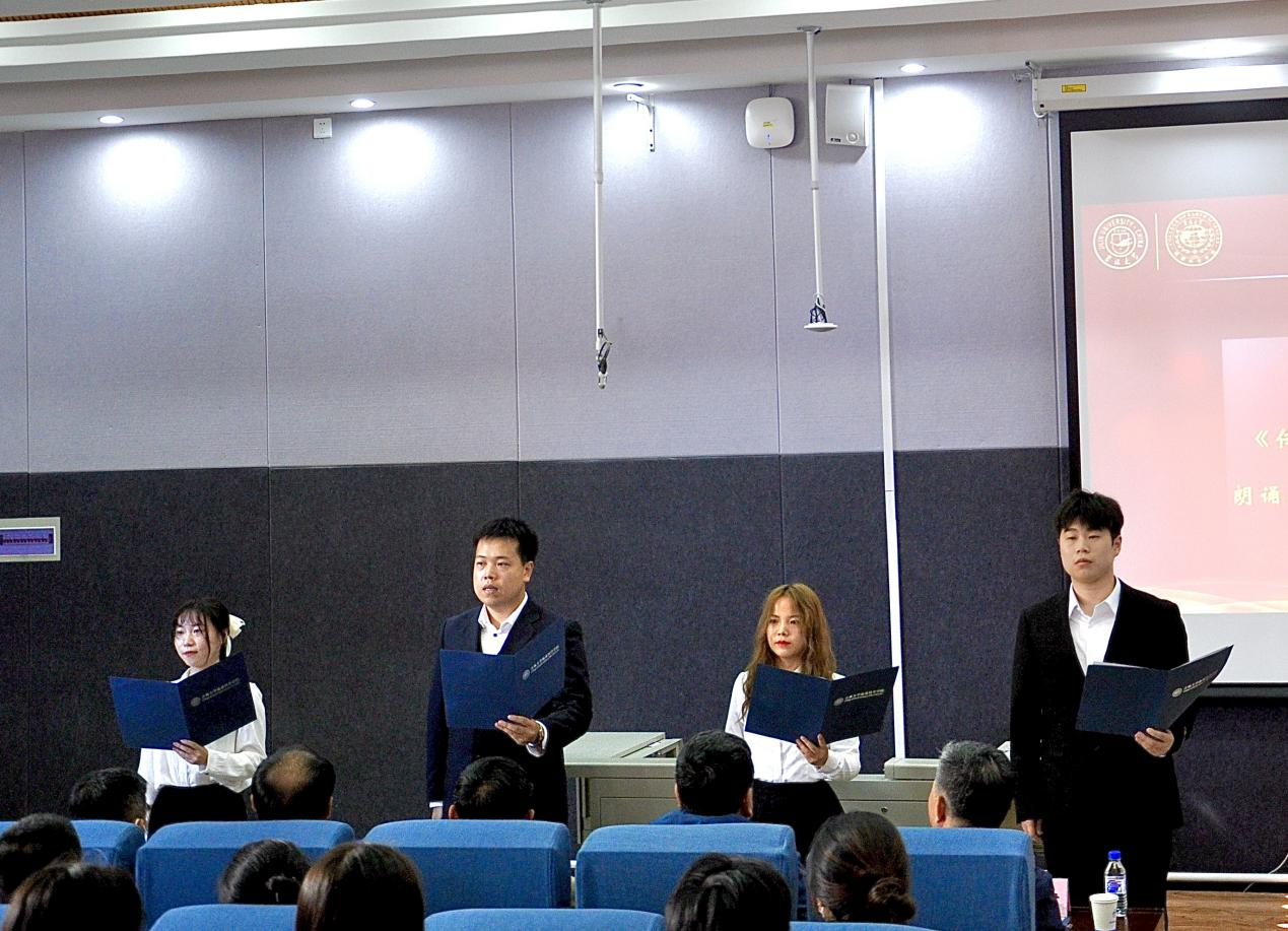 随后,2022级研究生贾祥鹤、李钧如、马培淞、梁安琪4位同学为在场师生带来了深情饱满的诗朗诵《传承地质精神,筑梦绿色中国》。抒发了同学们对地质行业的深深热爱之情,道出了同学们对学校、学院辛勤培育学生成长成才的深深感激之情。