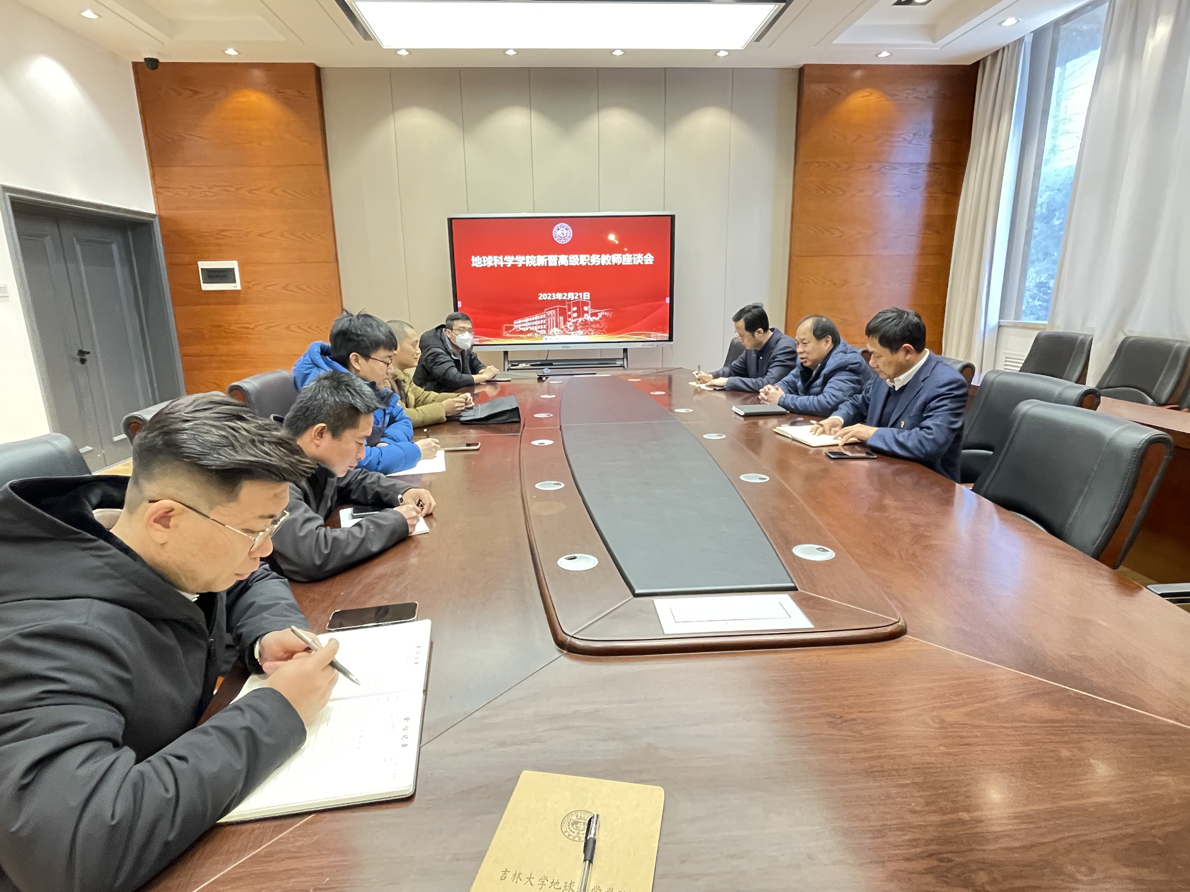 2023年2月21日,学院党委书记杨洲、院长单玄龙、副院长杨德彬与2022年新晋高级职务教师许中杰、李伟民、李晓波、李刚、苏思远等5人举行座谈会。