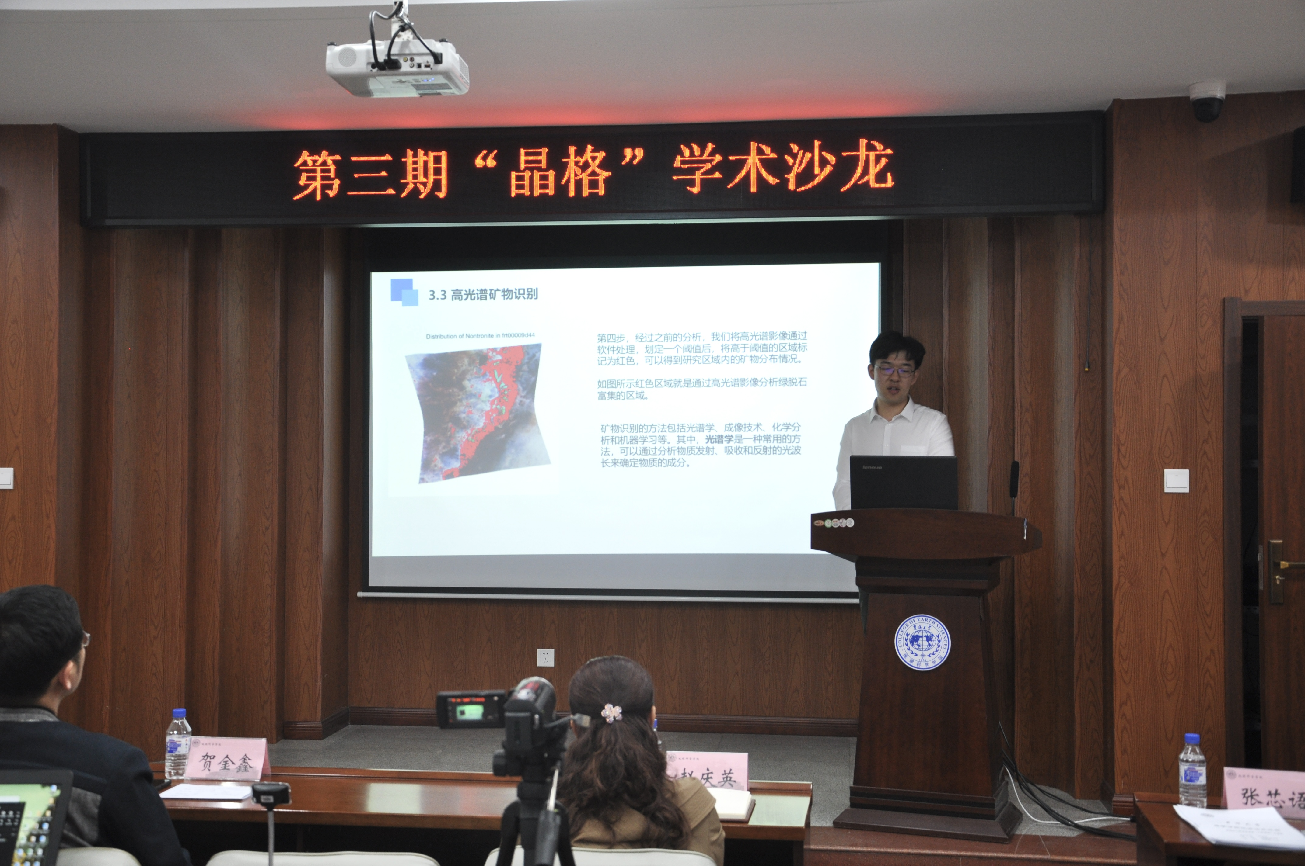随后,参会师生针对高光谱矿物识别精度与断层识别的异同性等问题进行交流探讨,各抒己见,现场气氛热烈。两位老师对四位主讲人研究内容的广度、深度及其创新性给予充分肯定,并鼓励同学们在今后的学习生活中积极参与学术报告,广泛阅读英文文献,取得创新性成果。