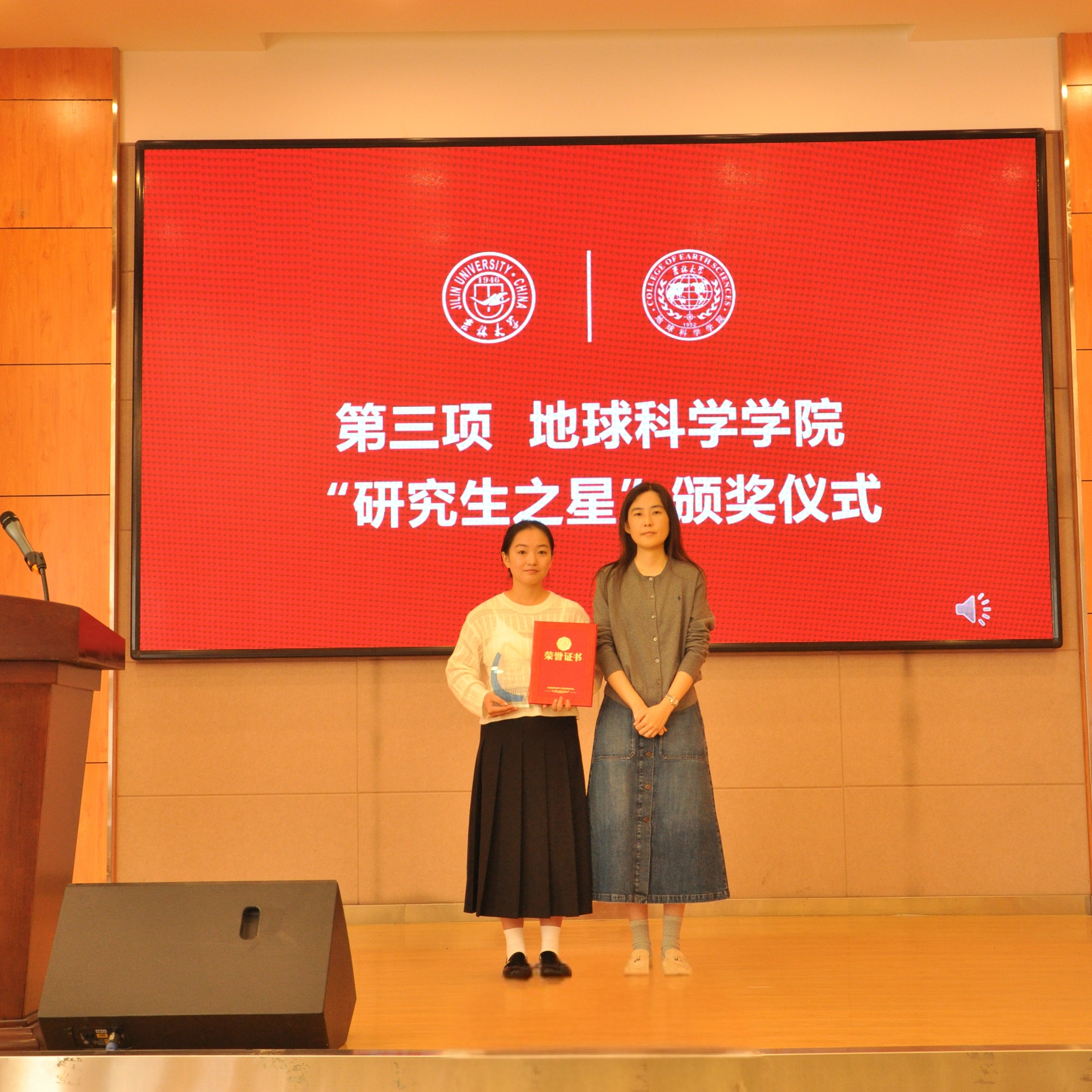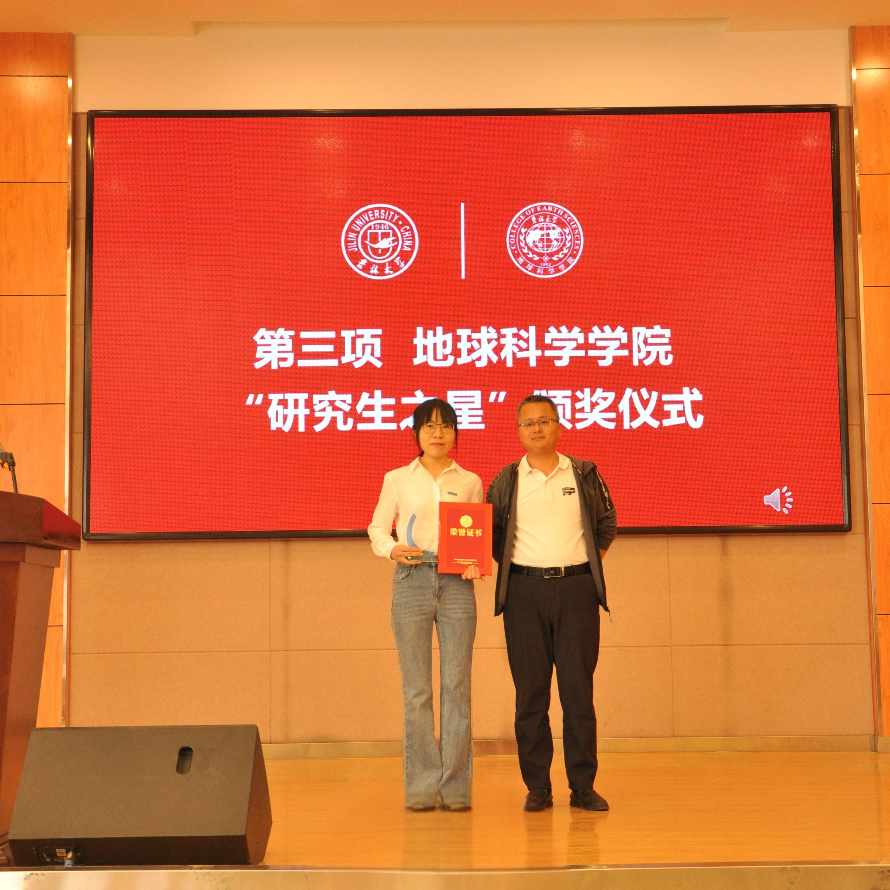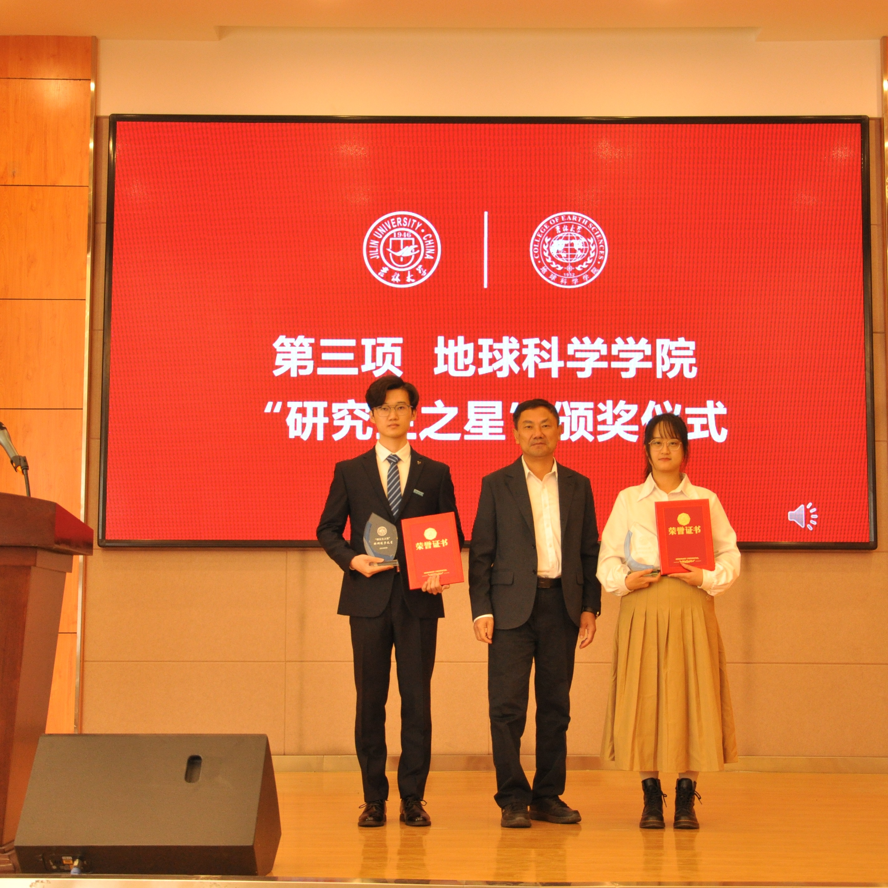 “研究生之星”的决定》。学院党委书记杨洲、学院院长单玄龙,专业学位培养指导委员会主任委员王璞珺、行政副院长苗广文、地质学系主任李世超、国土资源系主任王冬艳、博士生导师杨晨分别为“研究生之星”颁发荣誉证书和奖杯。