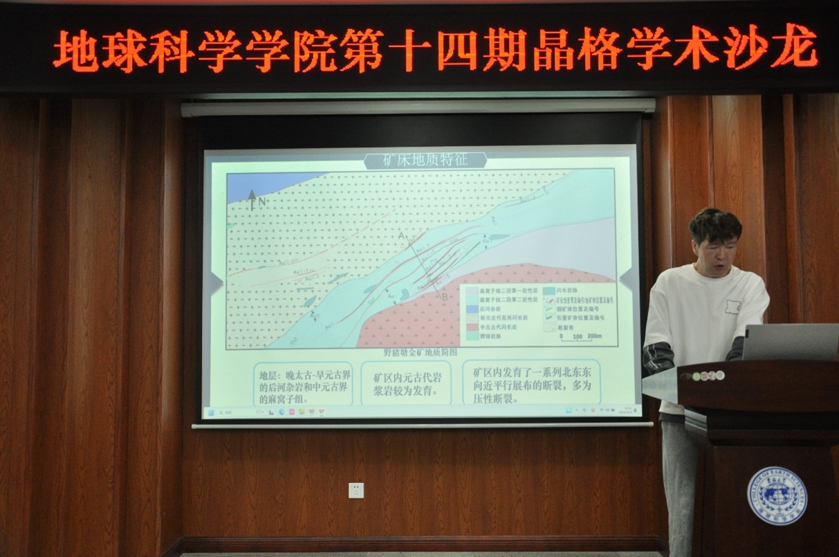 活动上,李成强同学探讨了东北中生代花岗岩的成因与构造环境背景,以及小兴安岭-张广才岭区域构造演化历史和成矿关系;王正松同学研究了吉林省安图县石人沟超镁铁质岩体地球化学、Hf同位素特征,揭示了促使区域岩浆体系达到硫饱和的主要机制;刘芯佟同学通过研究内蒙古黄岗矽卡岩铁锡矿床地质特征,揭示成矿岩浆演化及控矿因素,探讨了成矿早期流体特征及成矿意义;张泽仁同学分享了关于通化米架子金矿矿床地质特征方面的发现,认为米架子金矿床应为中低温岩浆热液型金矿床且成矿作用方式以充填作用为主;侯松林同学则立足于矿床地质、成岩成矿年代学、地质流体和H-O同位素等方面研究,聚焦于揭示其成矿时代、成矿流体的来源和演化、成矿区域区域构造背景;尼加提·伊里同学探讨了扬子北缘米仓山野猪塘金矿地质特征,表明野猪塘金矿形成于新元古代早期。