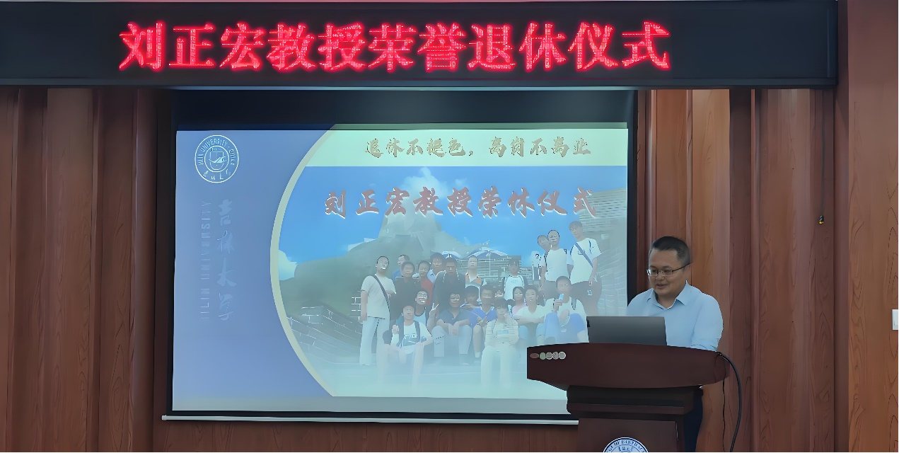 仪式上,衣长涛书记发表了深情讲话。他指出,构造地质学教研室的老师们和刘正宏教授的学生们自发为刘老师举办这场荣休仪式,充分体现了大家发自内心地认同刘老师的高尚品格,肯定其突出贡献,感念其深厚师恩。有感于此,衣长涛书记提出了三点期望:一是传承。希望以刘正宏教授为代表的退休教师们,在身体和时间允许的情况下,继续关注并参与学院建设,指导年轻教师成长。他强调,传承是学校的重要职责,不仅要传承知识,更要传承前辈们做人做事的态度与风骨。这种精神传承将对年轻人产生深远影响,激励他们在各自岗位上不断取得新成绩、作出新贡献;二是敬业。希望构造地质学教研室的年轻教师以刘老师的荣休仪式为契机,在回顾自身求学与科研道路的同时,继续坚守初心、爱岗敬业、心系集体。要学习鸽子楼前辈们的精神,勇于开拓,积极进取;三是协作。学校和学院是大团队,科研组和教学组是小团队。团队协作是取得成果的前提,每位成员都应在团队中找准自己的定位,承担相应职责。希望老师们无论身处何种团队,都能积极扮演好自身角色,贡献力量。