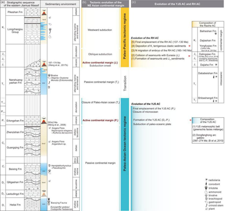 图3.东北亚陆缘晚古生代—中生代构造演化历史:(a)佳木斯地块东缘沉积序列和环境;(b)东北亚陆缘构造演化;(c)跃进山杂岩和饶河杂岩演化