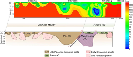 图2. MT 揭示饶河杂岩之下深部陆壳物质组成:(a)MT 剖面二维反演;(b)MT 剖面地质解译