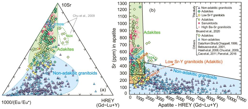 图5. 埃达克岩的磷灰石微量元素判别图解 (a)磷灰石1000/(Eu/Eu*)-10Sr-HREY三角判别图解;(b)磷灰石Sr-HREY二元判别图解