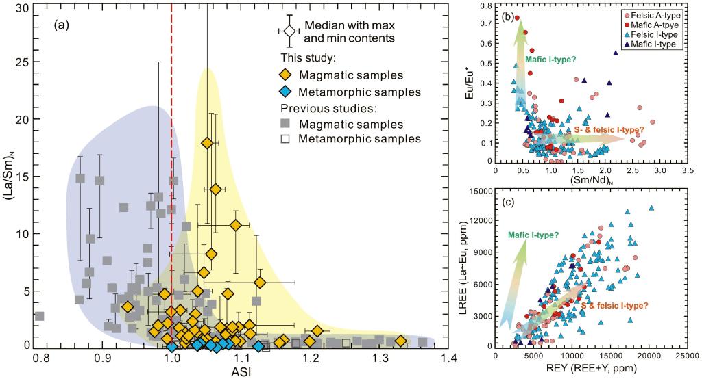 图3. (a)磷灰石(La/Sm)N与全岩ASI值协变关系图;(b)磷灰石Eu/Eu*与(Sm/Nd)N值协变关系图 (箭头所示演化趋势据Sha and Chappell, 1999);(c)磷灰石LREE与REY含量协变关系图 (箭头所示演化趋势据Sha and Chappell, 1999)
