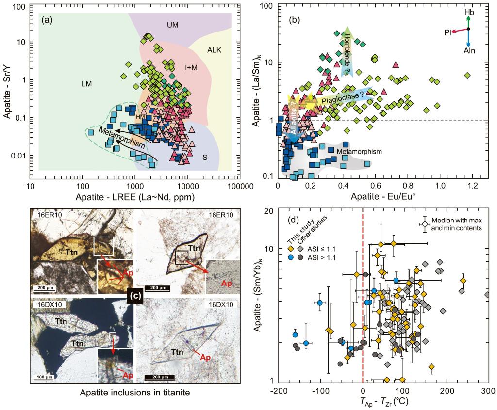 磷灰石的稀土配分模式可按照其与全岩的相似性分为“耦合型”和“解耦型”REE模式(图1)。其中,“耦合型”磷灰石REE模式与稀土元素的分配系数以及原岩成分密切相关;而以LREE亏损、HREE轻微富集为代表的磷灰石“解耦型”REE配分模式(图1),一方面主要是受到轻稀土矿物——褐帘石以及斜长石早期结晶的影响,另一方面又与岩浆期后变质作用的发生存在关联(图2a,b)。此外,通过详细的岩相学证据以及锆石–磷灰石饱和温度计算(图2c,d),进一步修正了前人关于独居石、榍石以及锆石分别对磷灰石轻、中、重稀土元素竞争的认识