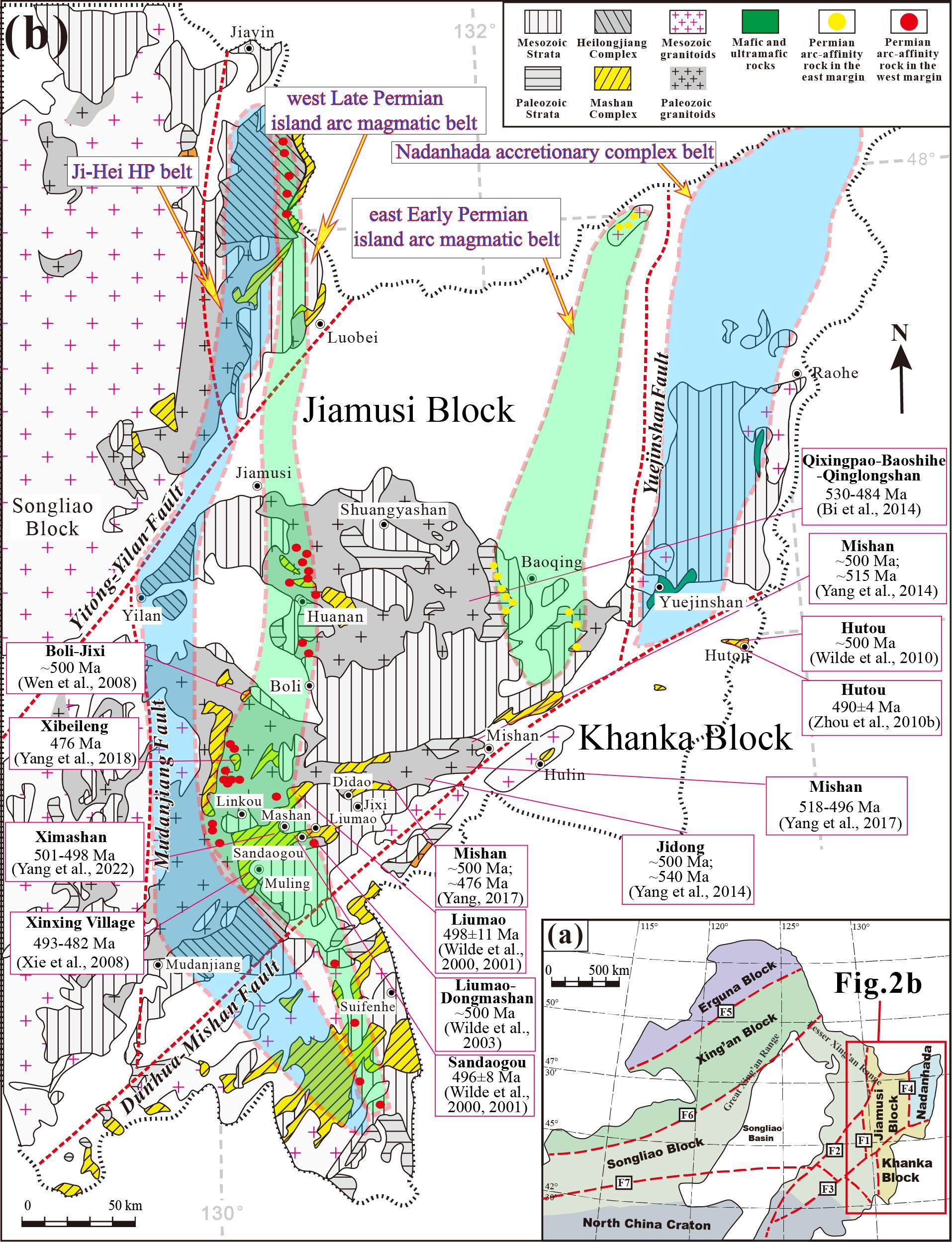 古亚洲洋与古太平洋构造体制之间的叠加与转换过程,一直是国际地学研究的重大科学问题。然而直到目前,两大构造域转换的具体时间、转换过程与动力学背景等存在诸多分歧。佳木斯地块位于中亚造山带的最东缘,也是古亚洲洋与环太平洋构造域叠加与转换的核心(图1),记录了丰富的古大洋构造演化的关键信息。因此,对佳木斯地块进行系统性的研究和总结,对详细刻画中亚造山带东段古大洋构造体制转换过程具有重要意义。