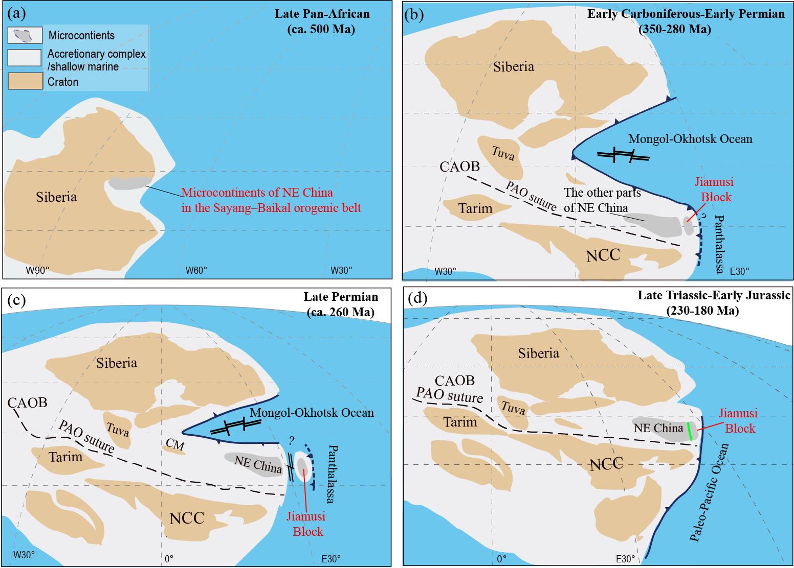 佳木斯地块的基底以麻山群为主,为一套孔兹岩系,由麻粒岩、变粒岩、片麻岩、石墨片岩以及大理岩组成。麻山群中广泛发育原岩时代为540-476 Ma的高级别变质岩(图3),且经历了晚泛非期(~500 Ma)的变质作用。这与西伯利亚克拉通南缘的Sayang–Baikal造山带麻粒岩相变质作用具有可比性(图1)。而盖层沉积显示了与其他微陆块存在一定的区别和联系(图2)。结合前人所识别的1300公里的中国东北晚泛非期孔兹岩变质带,本研究认为佳木斯地块与中国东北其它微陆块在古生代之前为统一的地块单元,且都经历了晚泛非期的变质作用,起源于西伯利亚克拉通南缘的Sayang–Baikal造山带。