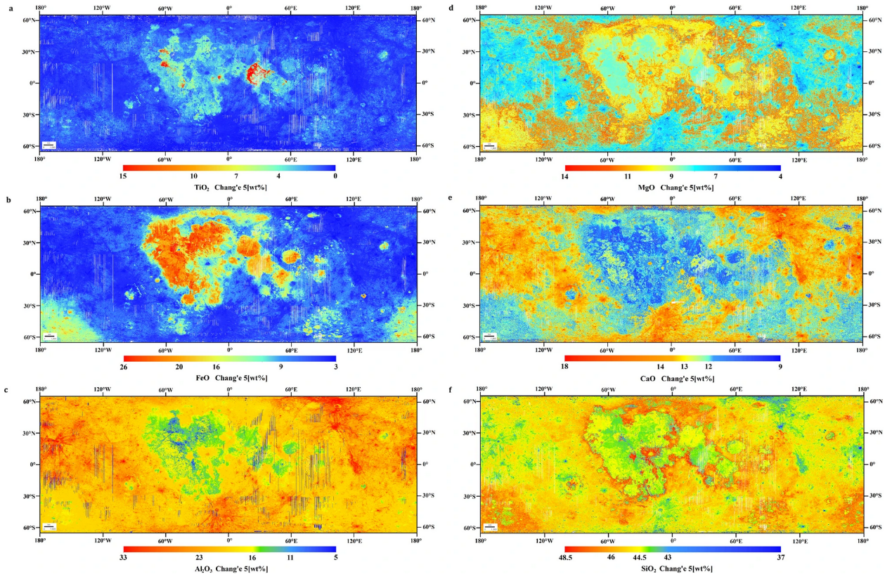 结合我国嫦娥五号、美国Apollo苏联Luna样品数据的月球表面化学成分分布图