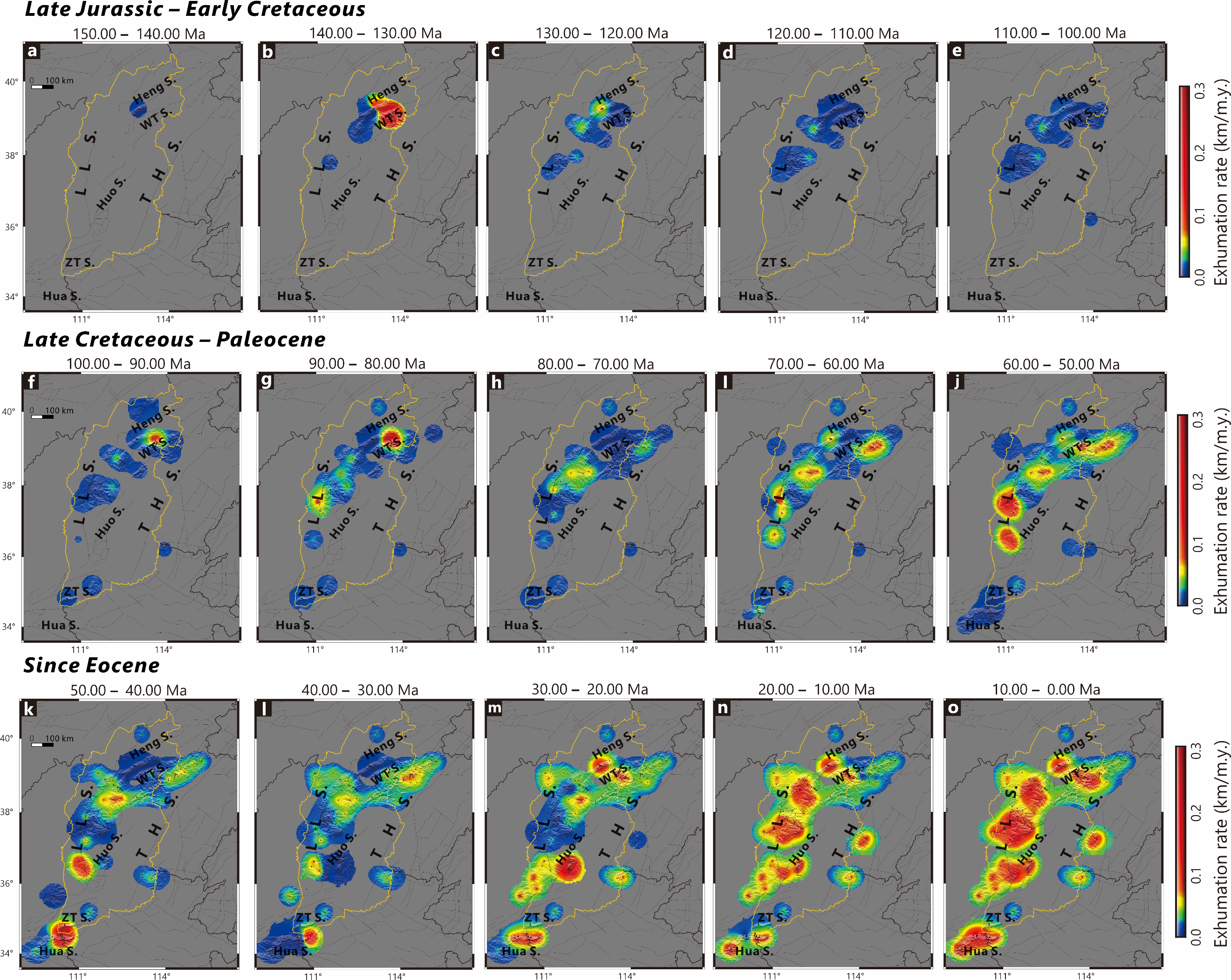 图3 山西裂谷系近150Ma以来的空间剥露历史,时间间隔为10Ma