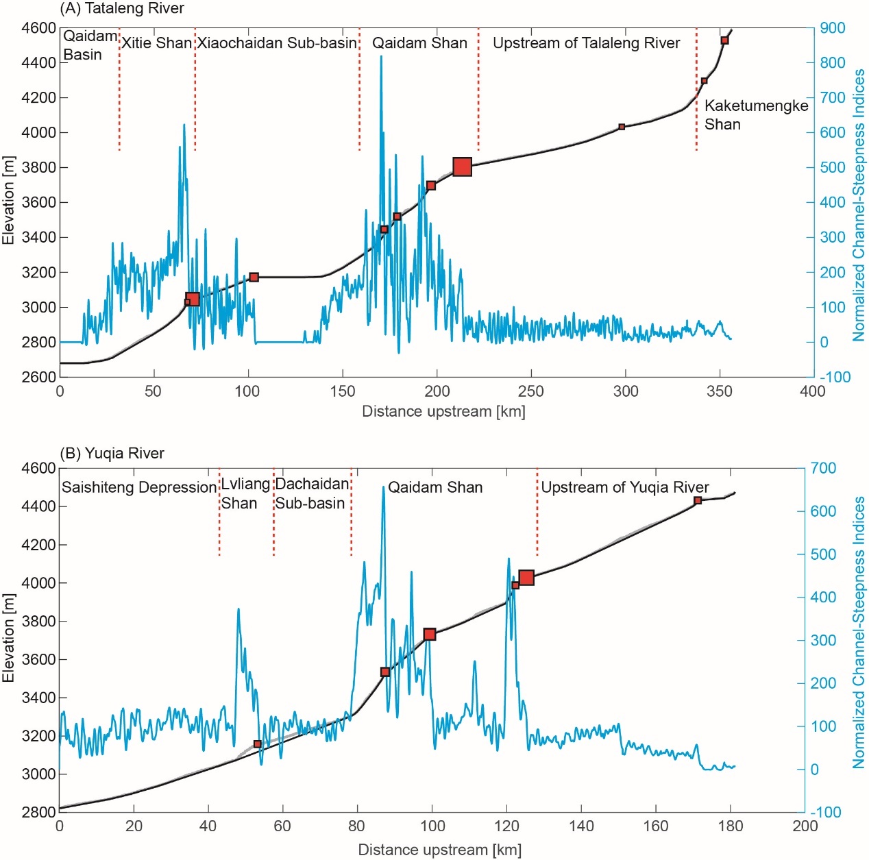 2. 柴达木盆地北缘中西段的鱼卡河和塔塔棱河主要呈现阶梯状的河流纵剖面,平缓段和陡变段交替出现。河流陡峭指数的峰值出现在柴达木山山前地区,祁连山中部和绿梁山-锡铁山一线河流陡峭指数偏低(图2)。