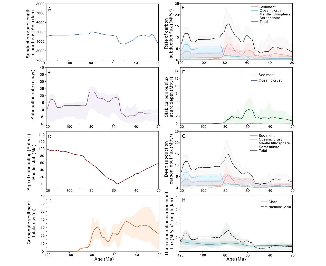 图2 晚中生代—新生代早期西太平洋俯冲板块关键参数和俯冲碳通量重建结果(A)俯冲带长度;(B)俯冲速率;(C)俯冲板块年龄;(D)碳酸盐岩厚度;(E)俯冲碳通量;(F)弧脱碳通量;(G)深俯冲碳通量;(H)西太平洋板块单位弧长内深俯冲碳通量与全球平均值对比