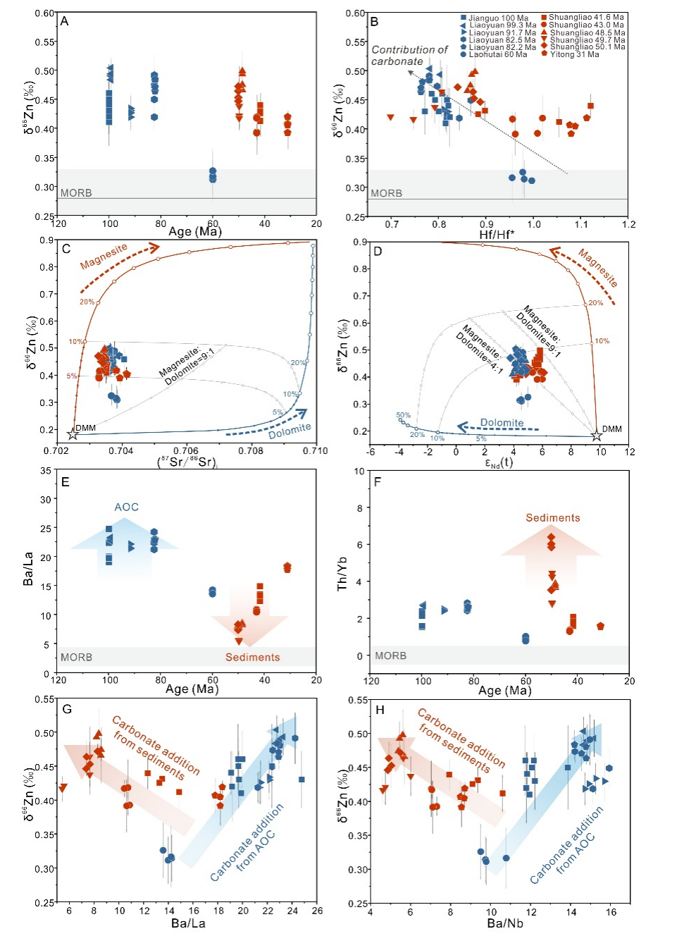 2. 查明了晚中生代—新生代早期东北亚板内玄武岩地幔源区中再循环碳量及其来源随时间的变化。针对东北亚集中出露且时代连续的晚中生代—新生代早期板内玄武岩(图1),开展了全岩主微量元素和Sr–Nd–Pb–Zn同位素的综合研究,查明了地幔源区中再循环碳量为0.4 – 1.4 wt.%(图3C和3D),并分别在92 Ma、60 Ma和43 Ma显示明显的低值(图4)。此外,不同时期地幔源区中再循环碳的来源存在明显差异,大于60 Ma样品的地幔源区中的碳主要来源于蚀变洋壳,而小于60 Ma样品的地幔源区中的碳则主要来源于沉积物(图3E-H)。