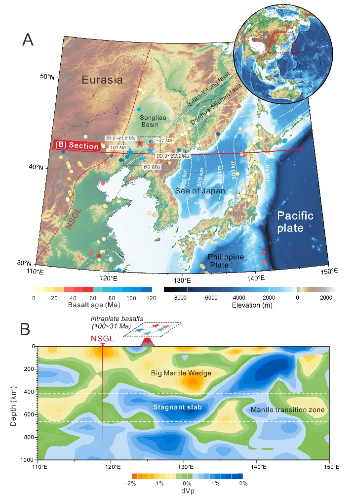 针对以上问题,我院许文良教授引领的“地球深部动力学创新团队”成员王枫教授等,通过对比分析西太平洋俯冲-滞留板块俯冲碳通量及其主要贡献储层随时间演化,与东北亚晚中生代-新生代早期板内玄武岩(图1)所记录的再循环碳量及其来源随时间演化之间的相关性,限定了与滞留板块相关的深俯冲碳循环的时间。具体研究成果如下: