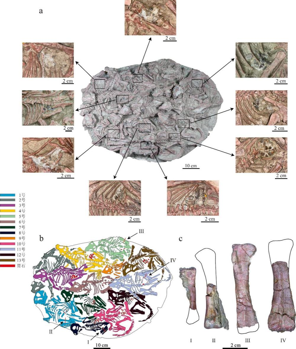 恐龙演化研究中心(dinosaur evolution research center,DERC)的一窝呈集群保存状态的Psittacosaurus化石(JLU DERC-Z0007)。该标本产自辽宁省北票市陆家屯义县组地层,包含了13具保存完整的鹦鹉嘴龙幼体,它们来自同一巢穴,骨骼连接完好且朝向一致,属于原地埋藏的集群化石(*这件特殊的化石被研究人员戏称为“十三太保”,后续将有相关科普文章推出)。研究方法聚焦于个体发育以及进食行为的解析。利用对消化系统中的石块进行了详细检测,以验证其是否属于胃石;利用组织学的方法,判断化石所处的生长发育阶段,及其是否经历了姿态转换。
