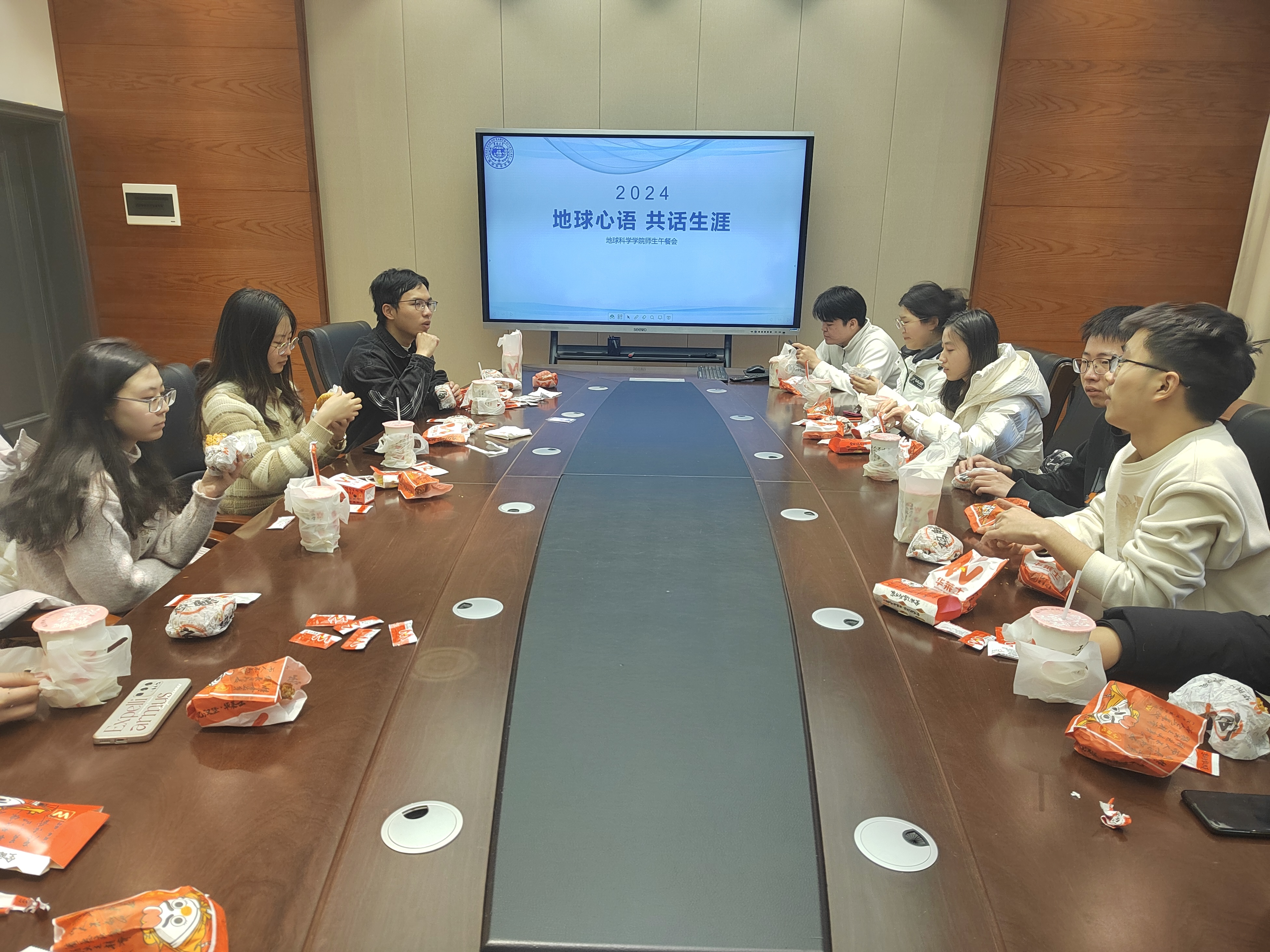 为加强师生沟通交流,提升学生自我管理能力,促进学生的全面发展,2023年3月1日,我院于鸽子楼109-1举办了“地球心语,共话生涯”师生午餐会。学院团委书记兼2021级辅导员韩旭老师与2021级各班班委代表参与了此次午餐会。
