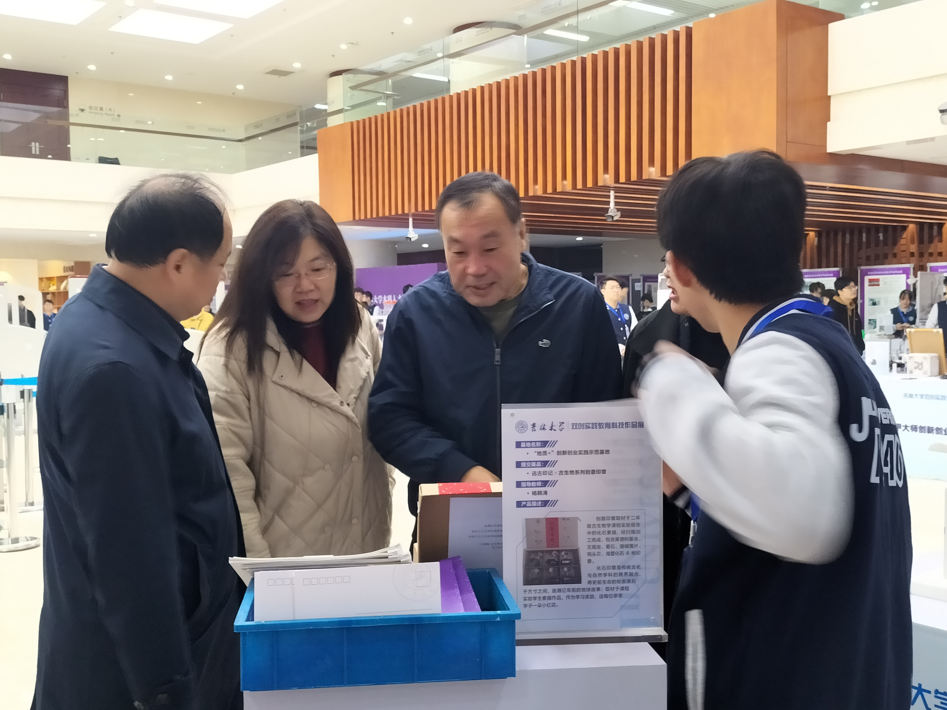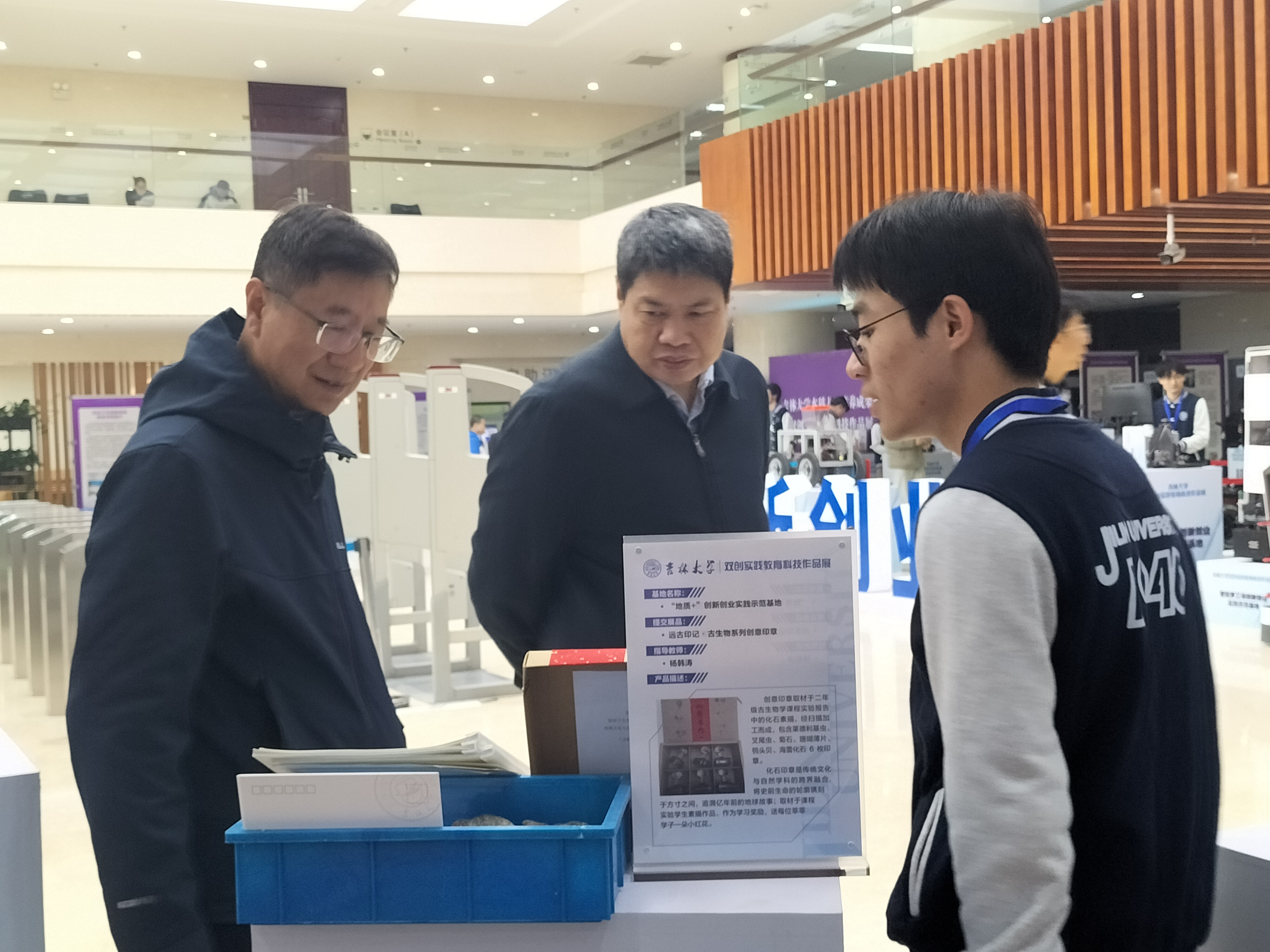 为充分展示我校在双创教育领域的创新实践成果和学生实践能力,以良好的状态迎接本科教育教学审核评估考察,学校于10月28日-11月1日在中心校区鼎新图书馆大厅开展双创实践教育科技作品展。依托于实验教学中心的“地质+”创新创业示范基地提交“远古印记古生物系列创意印章”参加作品展,展示我院多年双创教育教学成果。