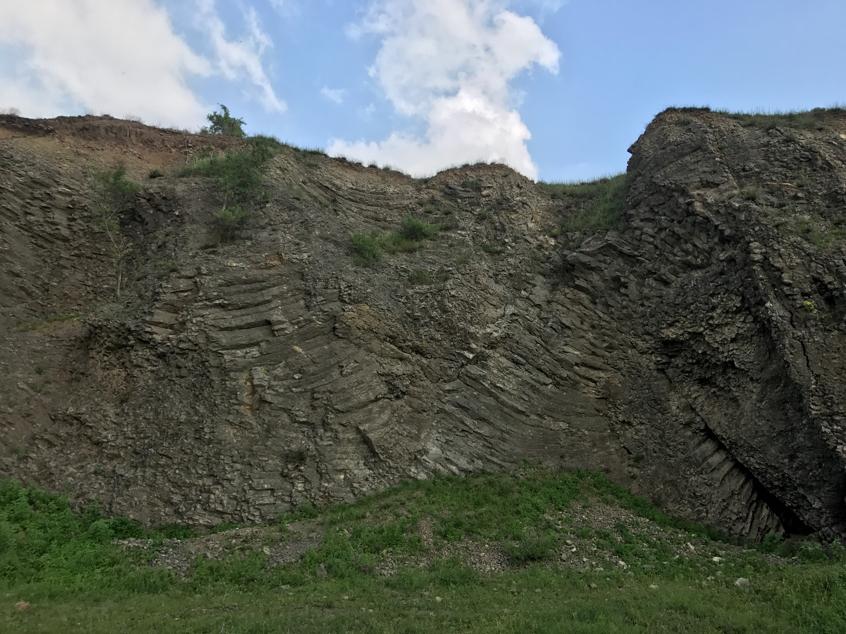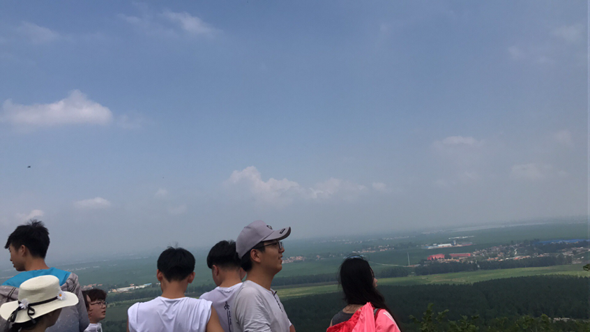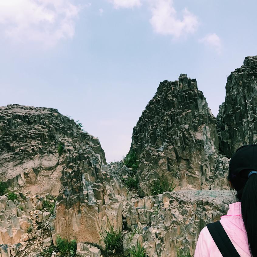 将近十一点,同学们到达大孤山景区门口。早听说大孤山是一处景区,此处看见门口卖水的小贩和几个游人,猜想兴许此处风景独好,同学们更加热情高涨,紧紧跟随带队老师。虽然此处相比西尖山,上坡路更多更长,同学们却毫不懈怠,一鼓作气,在清爽解暑的微风中征服了高耸的百级台阶,终于喘着粗气,登上了大孤山顶。首先映入眼帘的,是几处正立的玄武岩塔林,同学们靠坐在塔林上,躲进树荫里,放眼望去,远处庄稼地里绿意盎然,高梁长势喜人。将近正午,在老师的示意下,同学们快速吃完了准备好的午饭。经过老师讲解,同学们了解到:此处玄武岩均形成于侵出火山作用,张节理形成塔林间的破碎沟,且此处的岩石无分层,应是在短时间内“一蹴而就”……下午一点半,我们带着满满的笔记,踏上了下山之路。