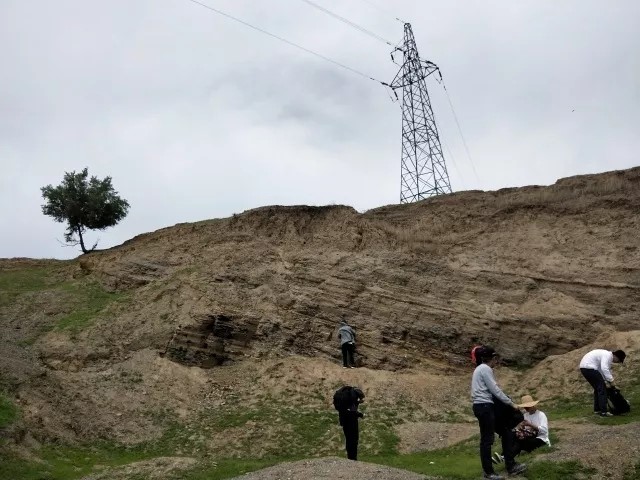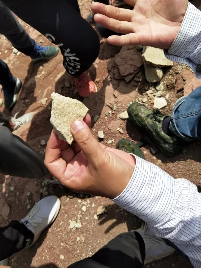 在第二站我们观察了姚家组剖面,此剖面主要由砖红色泥岩组成,夹紫色粉砂岩和介形虫层。在这里老师仔细的讲解了泥裂及其地质意义,同时向同学们介绍了正逆断层,并让同学们对断层进行素描。在姚家组也能采集到大量的介形虫化石,这些介形虫大小如同米粒,分布十分密集。