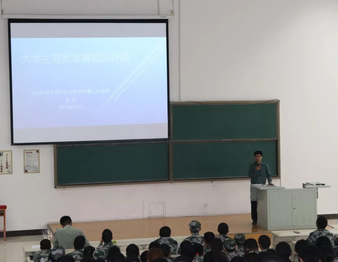 党委副书记兼副院长曲珩在李四光楼二阶教室为2018级全体新生上了一节主题为大学生党员发展知识介绍的思政教育课。