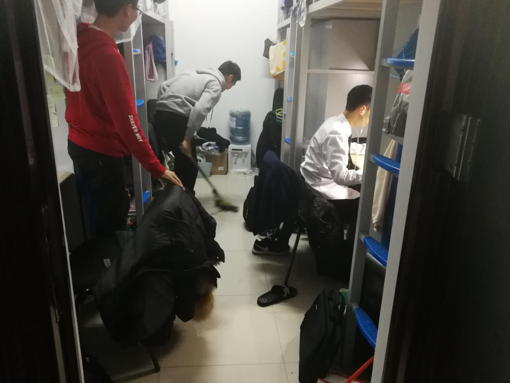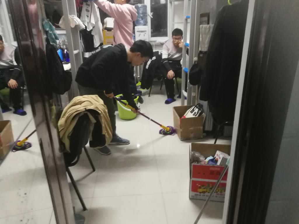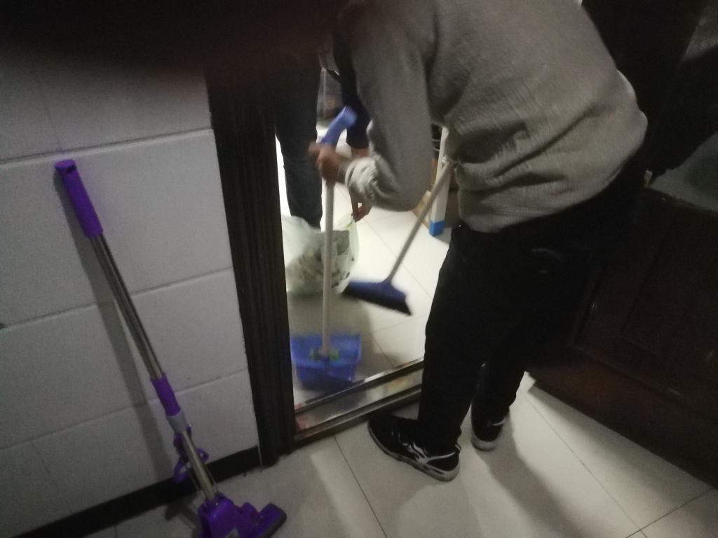 曲老师与学生会带领我院18级学生在南苑二公寓和文苑六公寓展开了一场寝室卫生保卫战——大扫除。