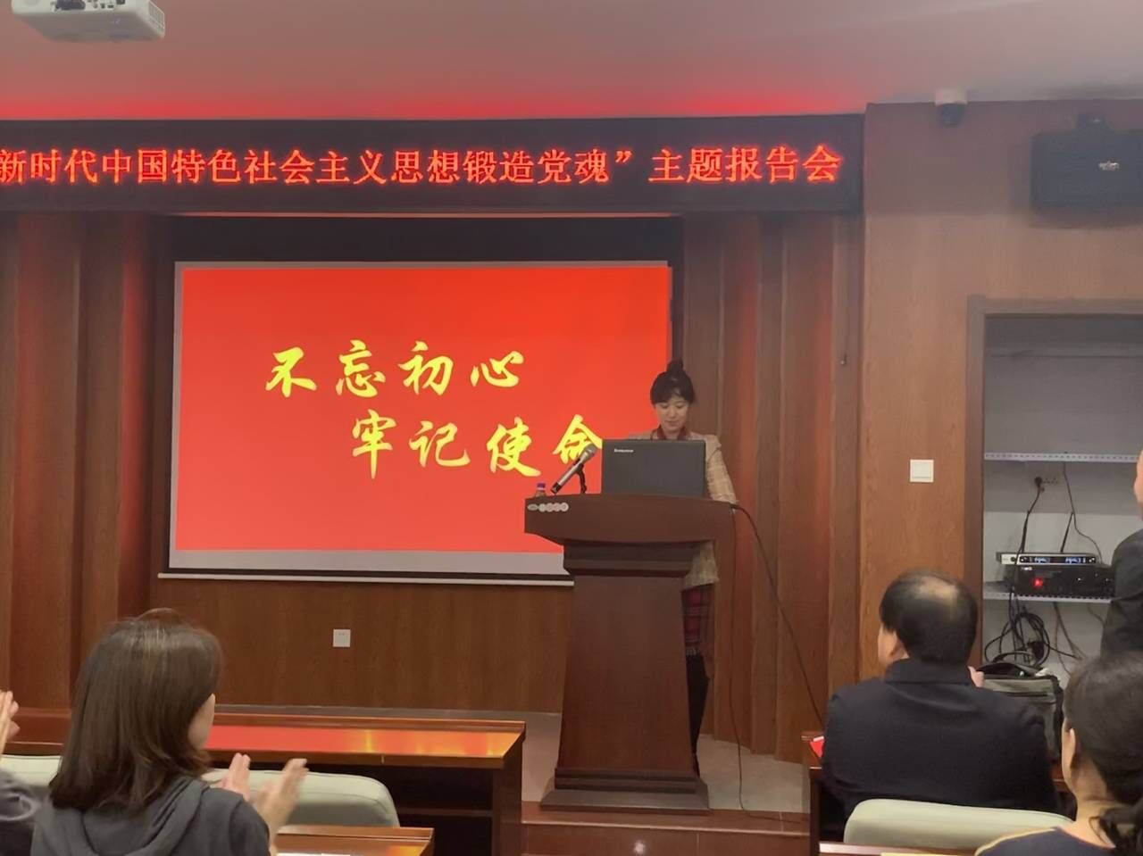 聂老师的报告首先回顾了中国共产党的历史,讲解了中国共产党初心使命的形成、发展、内涵与时代意义,分析了习近平新时代中国特色社会主义思想在保持初心、践行使命、锻造党魂中的意义和作用。最后结合中国共产党的历史发展进程提出如何保持党员的先进性和纯洁性。不忘初心、牢记使命,便是坚守党魂;便是坚定信念,勇往直前;便是即使前路崎岖,还是毅然而行;便是即使困难重重,也不动摇意志;便是自始至终的坚持,便是持之以恒的努力。
