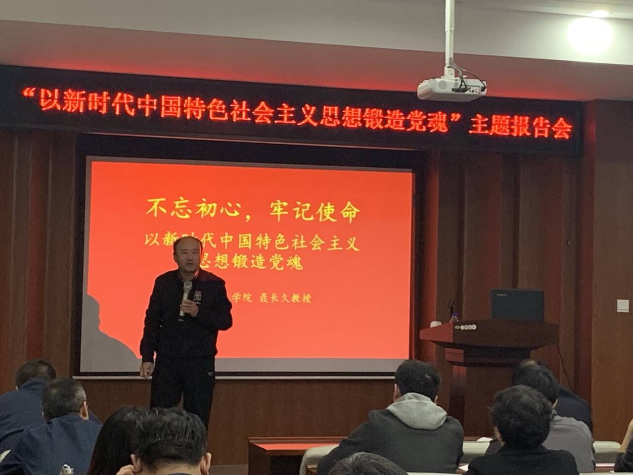 马克思主义学院副教授,新疆医科大学客座教授聂长久老师为全体党员做主题报告,报告的题目为“不忘初心,牢记使命——以习近平新时代中国特色社会主义思想锻造党魂”。