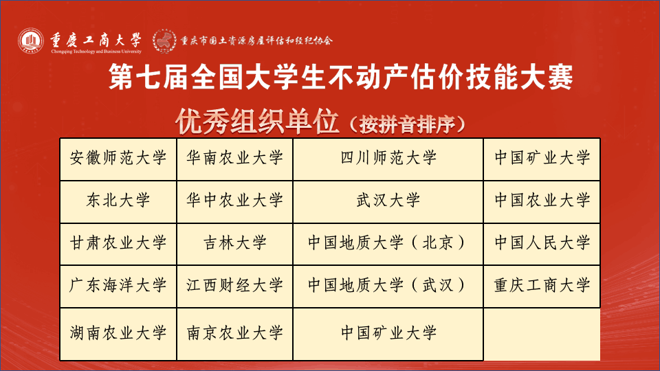 第七届全国大学生不动产估价技能大赛决赛在重庆举行。此次大赛以“面向中国式现代化的不动产估价"为主题,由教育部高等学校公共管理类专业教学指导委员会主办,重庆工商大学公共管理学院承办,全国22家行业机构协办。大赛共吸引了包括中国人民大学、中国农业大学、武汉大学、51黑料